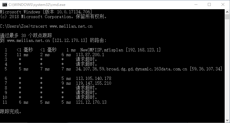 從圖1中可以看出,從本地主機到m.rdwljcjuz.cn這臺主機共經(jīng)過11個路由器轉(zhuǎn)發(fā)才最終到達目的地,并且成功解析121.12.170.13地址的主機名,而且從返回的結(jié)果中可以看出,數(shù)據(jù)包從本地發(fā)出后經(jīng)過的第一個路由地址為192.168.123.1,這是本地主機所屬網(wǎng)絡(luò)的外網(wǎng)中,第一個路由服務(wù)器地址。1、Tracert工作原理