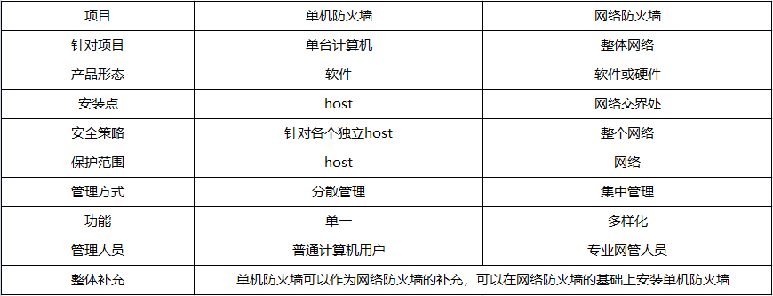 2.防御對象方面,可分類為單機防火墻與網(wǎng)絡(luò)防火墻,區(qū)別于防御對象。