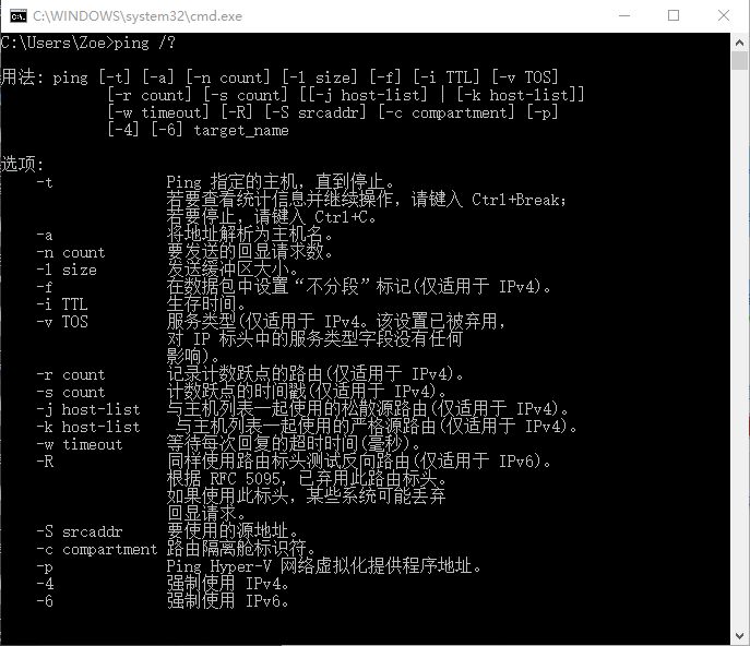 4) -iTTL 指定發送回響請求消息的IP標題中的TTL字段值, Windows XP系統主機默認值一般是128,TTL的最大值是255。