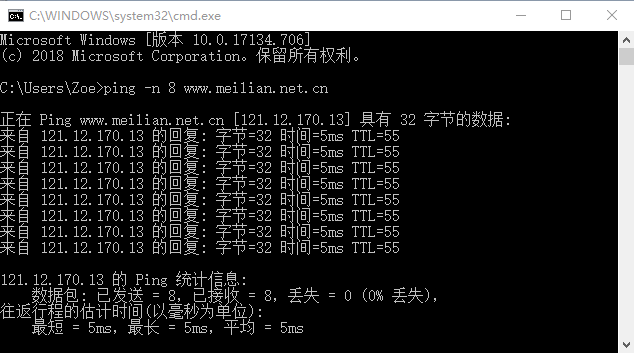 例美國服務器使用“-n”參數指定對主機www.meilian.net發送8次ICMP數據包命令執行情況如圖4所示: