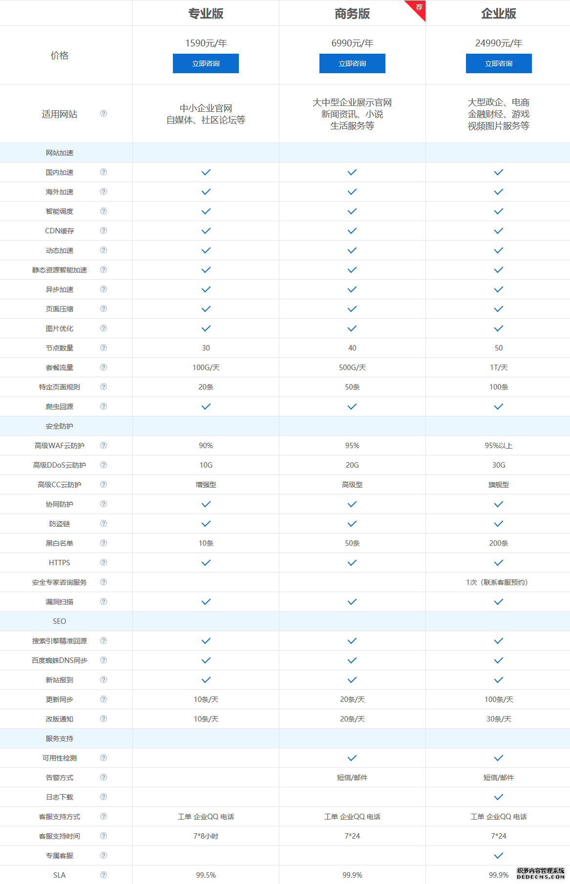| 產(chǎn)品類型 | 適用網(wǎng)站 | CDN節(jié)點 | 套餐流量 | CC防護 | DDoS防護 | SEO更新同步 | 客戶支持 | SLA可用性 | 價格 |